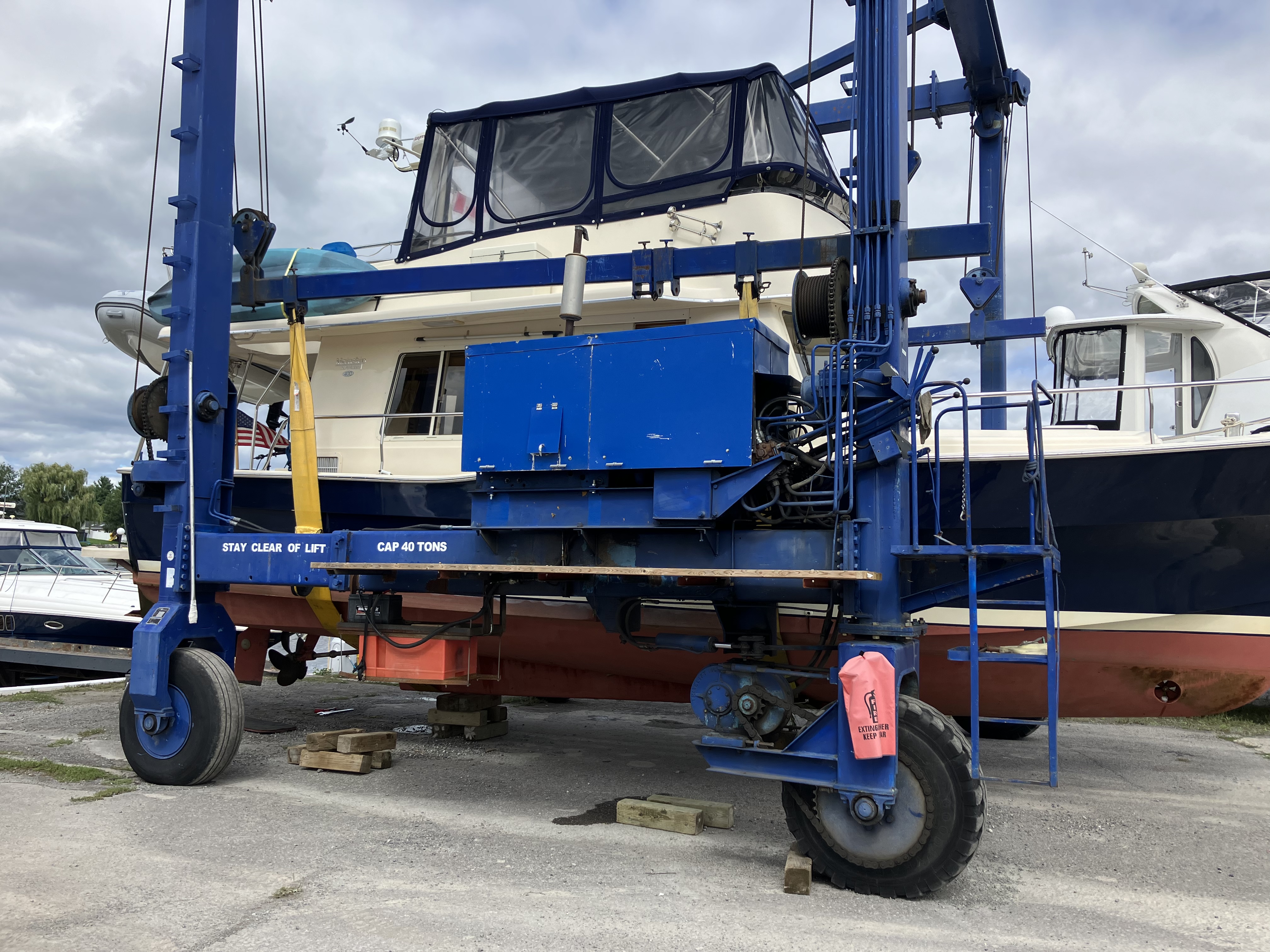 The most excellent crew at Hurst has taken our problem to heart, and right after lunch they pulled Blue Horizon out of the water so we could assess the damage and come up with a plan.